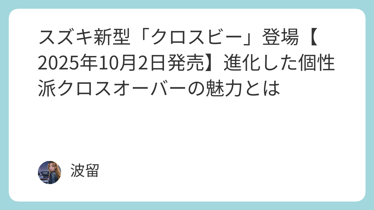 2025年10月2日、スズキは小型乗用車の新型「クロスビー」を発売しました。価格2,157,100円~2,500,300円2025年10月2日、スズキは小型クロスオーバー「クロスビー」の新型モデルを発売しました。遊び心あるデザインと広々とし...